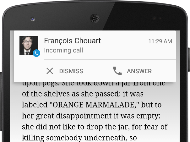 Key notification alerts such as incoming calls appear in a heads-up notification—a small floating window that allows the user to respond or dismiss without leaving the current app.