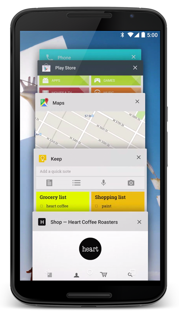 Android 5.0 introduces a redesigned Overview space (formerly called Recents) that’s more versatile and useful for multitasking.