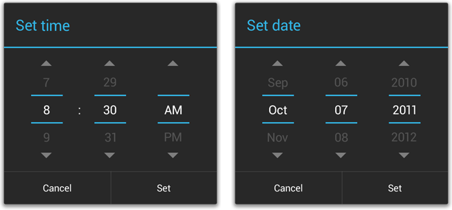 Android provides these as ready-to-use dialogs. Each picker is a dialog with a set of controls for entering the parts of the date (month, day, year) or time (hour, minute, AM/PM). Using these in your app helps ensure that a user's specification of a data or time input is valid and formatted correctly. The format of a time and date picker adjusts automatically to the locale.