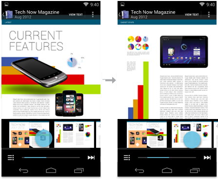 In addition to supporting swipe gestures to move left or right through pages, Magazines provides a thumbnail view control that lets people quickly jump to specific pages.
