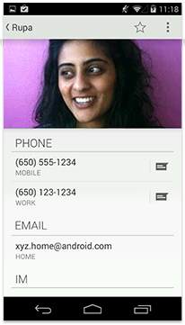The purpose of the People app's detail view is to surface communication options. The list view allows for efficient scanning and quick access of phone numbers, email addresses and other information items. Split items are used to combine calling and messaging into one compact line item.