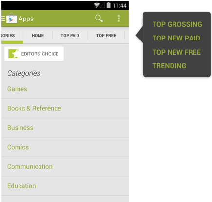 The Play Store app uses tabs to simultaneously show category choice and content. To navigate between categories, users can swipe left/right on the content.