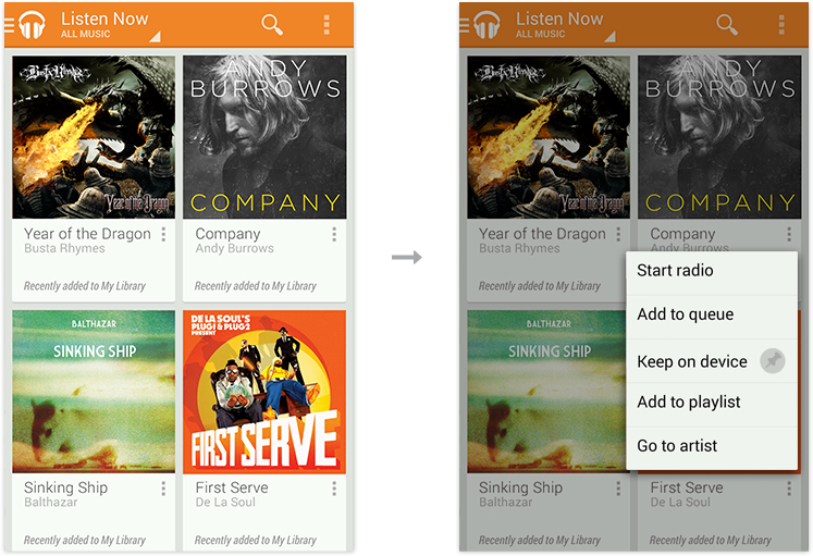 Play Music allows navigation among artists, albums, and playlists through rich content display. It is also enriched with tailored recommendations and promotions that surface content of interest to the user. Search is readily available from the action bar.