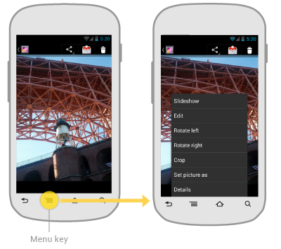 Android phones with traditional navigation hardware keys don't display the virtual navigation bar at the bottom of the screen. Instead, the action overflow is available from the menu hardware key. The resulting actions popup has the same style as in the previous example, but is displayed at the bottom of the screen.