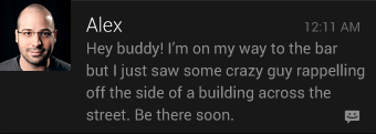 The base notification layout has not changed, so app notifications designed for versions earlier than Jelly Bean still look and work the same. Check the updated Notifications page for more details.