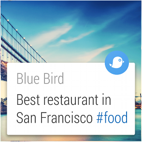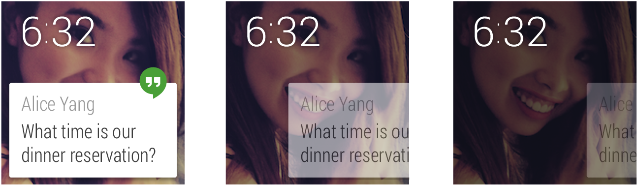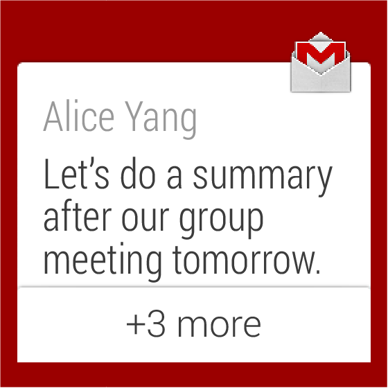 App icons appear in a fixed position overhanging the edge at the top right of the card by default for all notifications in the Context Stream. This is an opportunity for cards to be recognized as coming from a specific source. Photo backgrounds should be used only to convey information, not to brand a card. App icons are necessary only on the leftmost card; it is not necessary to add the app icon to pages.