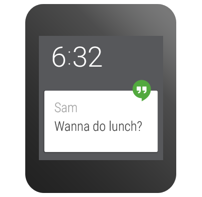 Cards are the notification system that bridges information between the wearable and a mobile device. Cards are also how most applications communicate with users. The user will be notified on the wearable about items such as emails and messages. As a watch face developer, you need to accommodate both large and small cards in your design. Your watch face can specify a preference for the card size, but users may override this setting. Users can also temporarily hide cards by swiping down on them.