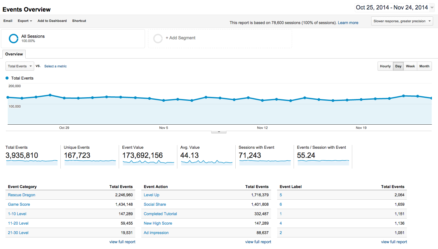 One of the most common and easiest ways to track user behavior is with events. Events are powerful for capturing specific actions that are relevant to your business. They are often used to capture a specific moment in time; an example of an event might be a Level Up. In this example, you'd configure your code to send data to Google Analytics every time a user successfully passed a level. You can send multiple properties with an event so you can group your events based on the analysis you intend to do.