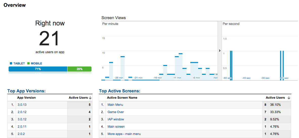 Google Analytics reporting is available in real-time. This powerful capability helps you understand app usage as it happens. Are users updating to your latest version? Is your new marketing campaign having the effect you expected? Is a scheduled in-app event driving up usage? You can answer all these questions and more while they're actually happening.