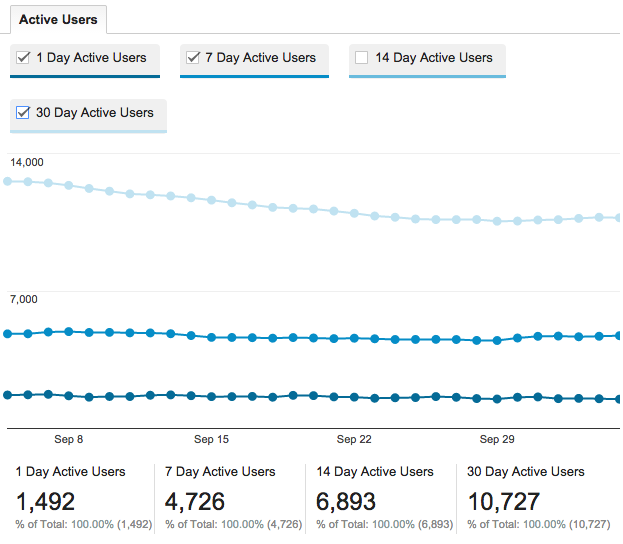 Google Analytics’ Audience Reporting section highlights a wealth of data about your users’ characteristics: what app versions they’re using, what devices they’re on, where they’re from, and what they're interested in. Among these, the Active Users reports highlight how users come back over time.