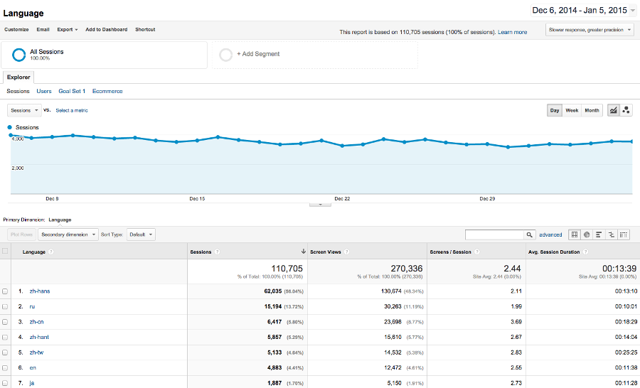 Drilling down to look at segments of your data helps you understand what caused a change to your aggregated data. All reports in Google Analytics provide for segmentation of your traffic. For example, each row in your Language report shows how a specific segment performed. This lets you compare different segments and understand which languages are bringing in the highest value traffic.
