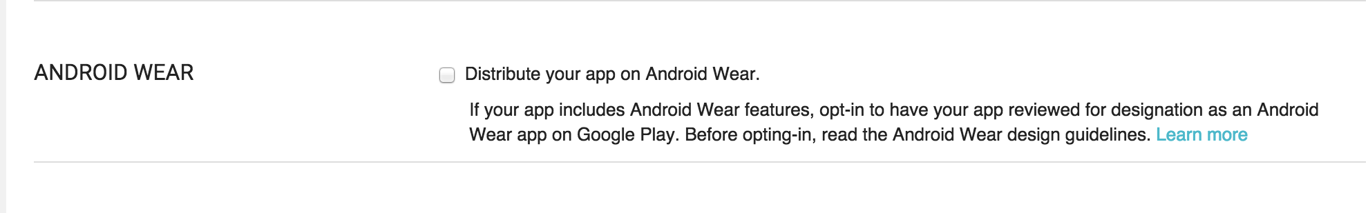 Before you publish to users, you may opt-in to Android Wear from the Pricing and Distribution section of the Developer Console. Opt-in means that you want your app to be made more discoverable to Android Wear users through Google Play, and that your app meets Wear App Quality criteria.