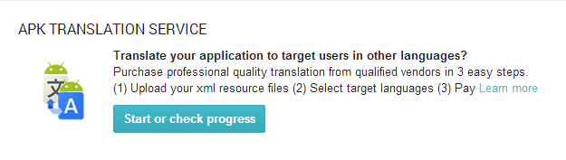 Google Play App Translation Service can help you quickly find and purchase translations of your app. In the Developer Console, you can browse a list of third-party vendors who are pre-qualified by Google to offer high-quality translation at competitive prices. You can upload the strings you want translated, select the languages you want to translate into, and select your translation vendor based on time and price.