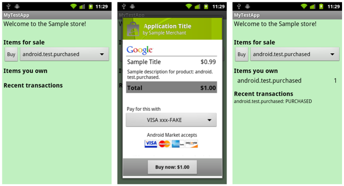 To test your implementation with static responses, you make an In-app Billing request using a special item that has a reserved product ID. Each reserved product ID returns a specific static response from Google Play. No money is transferred when you make In-app Billing requests with the reserved product IDs. Also, you cannot specify the form of payment when you make a billing request with a reserved product ID. Figure 1 shows the checkout flow for the reserved item that has the product ID android.test.purchased.