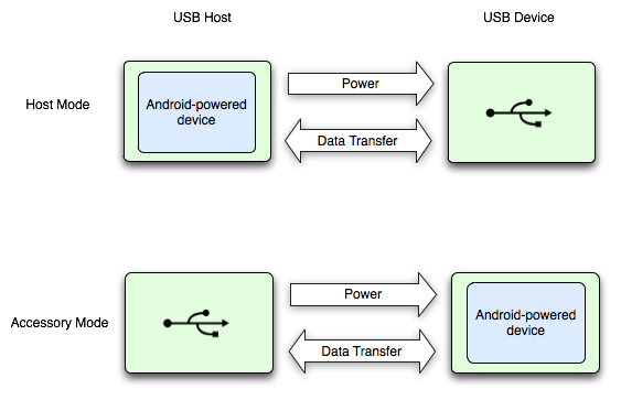 Figure 1 shows the differences between the two modes. When the Android-powered device is in host mode, it acts as the USB host and powers the bus. When the Android-powered device is in USB accessory mode, the connected USB hardware (an Android USB accessory in this case) acts as the host and powers the bus.