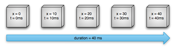 horizontally by 10 pixels. At the end of 40ms, the animation stops, and the object ends at