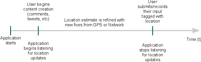 This lines up with the previous model of how user location is obtained in code (figure 1). For best location accuracy, you might choose to start listening for location updates when users begin creating the content or even when the application starts, then stop listening for updates when content is ready to be posted or recorded. You might need to consider how long a typical task of creating the content takes and judge if this duration allows for efficient collection of a location estimate.