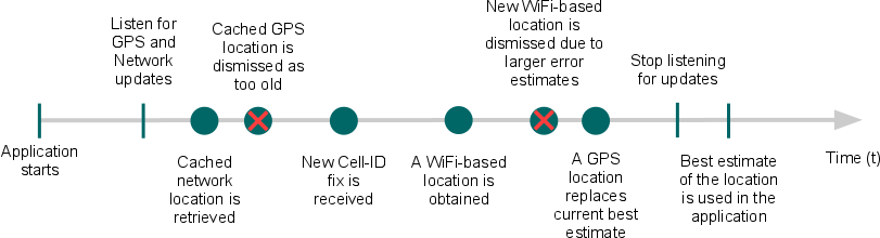 Figure 1 demonstrates this model in a timeline that visualizes the period in which an application is listening for location updates and the events that occur during that time.