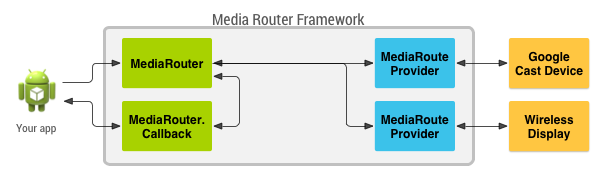 The media router APIs enable a broad range of media output to playback equipment connected to Android devices through wireless and wired means. To enable these connections, the media router framework abstracts the logical paths for audio and video output for an Android device. This architecture allows your app to quickly channel media content to connected playback devices such as home theaters and sound systems that provide Android media route support.