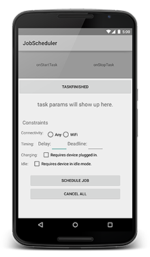 This sample app allows the user to schedule jobs through the UI, and shows visual cues when the jobs are executed.