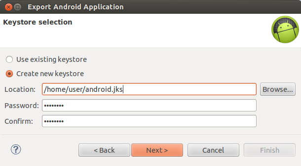 4. On the next window, enter the location to create a keystore and a keystore password. If you already have a keystore, select Use existing keystore, enter your keystore's location and password, and go to step 6.