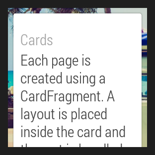 For example, the GridViewPager sample in the Android SDK contains the following adapter implementation that provides a set of static cards with custom background images: