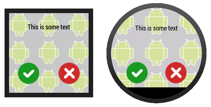When you create layouts for Android Wear apps, you need to account for devices with square and round screens. Any content placed near the corners of the screen may be cropped on round Android Wear devices, so layouts designed for square screens do not work well on round devices. For a demonstration of this type of problem, see the video Full Screen Apps for Android Wear.