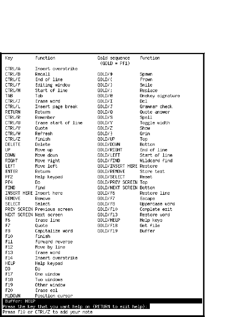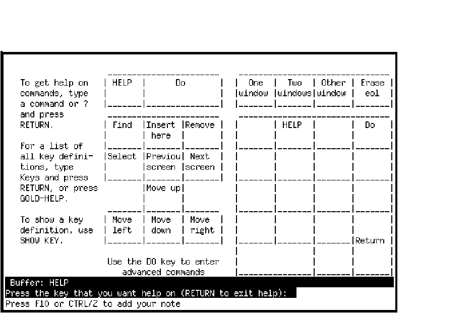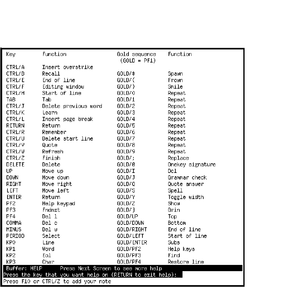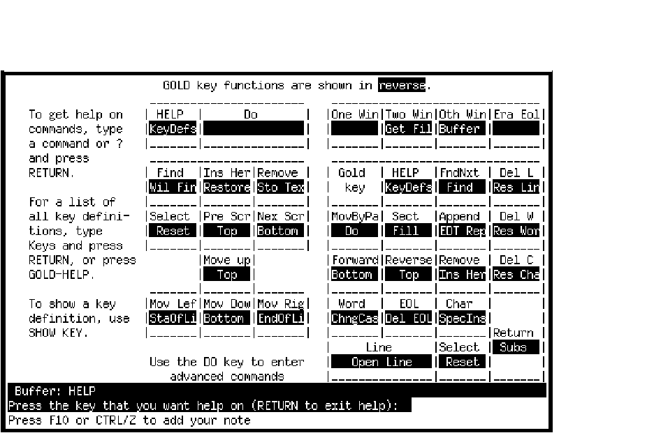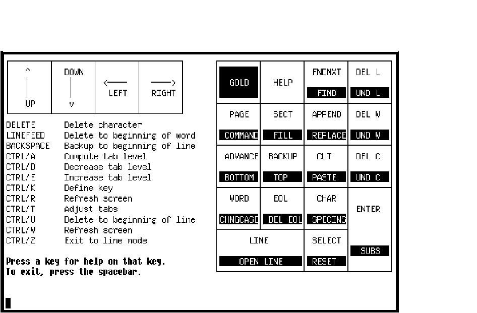 The key definitions display may also be generated anytime you are in edit mode by pressing GOLD-HELP.