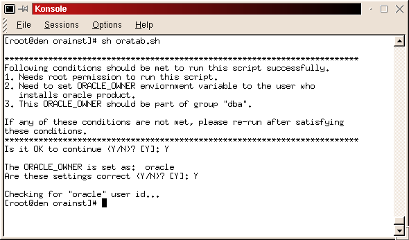 Change to the directory where you have unpacked the Oracle8051EE_Intel.tgz file (this is your staging directory for the installation process), and run the script to create the /etc/oratab file. This file is used by Oracle's startup script to determine which instances are running on the machine, and whether they should autostart when the machine is rebooted. More on this file later.