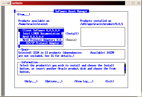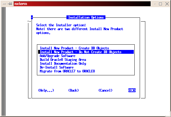 Select the custom install (see Figure 2). Read the preamble.txt file and press return to continue. Read the README.FIRST file and press return to continue. Select Install, Upgrade or De-install Software (see Figure 3). Select Install New Product--Do Not Create DB Objects (see Figure 4). Make sure the ORACLE_BASE and ORACLE_HOME environment variables are set correctly (see Figure 5). Press return to accept the defaults for your log files. It's a good idea to make a note of their locations, too. If anything goes wrong during the installation process, you may need to look at them. It is also a good idea to look at them even if everything works fine in order to learn more about the installation process (see Figure 6). Select Install from Staging Area (see Figure 7); make sure the staging area is set correctly. In my example, I used /home/oracle/orainst (see Figure 8). Select your language (see Figure 9). Press return to acknowledge the location of the root.sh post-install script. The default location is /u01/app/oracle/product/8.0.5/orainst/root.sh. Select the following products to install (see Figure 10):