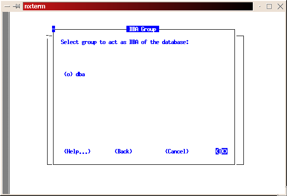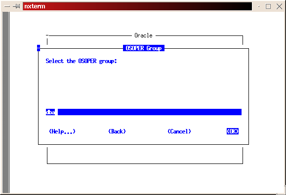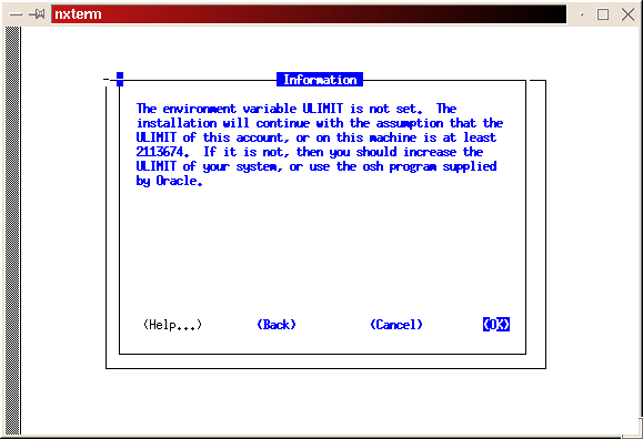 Use the space bar to select/deselect the products. Do not install the documentation. We will do that in a later step. After selecting all the products you want to install, tab to the Install prompt and press return. You will receive a warning about ULIMIT not being set. You can ignore this by pressing return (see Figure 11). Select dba as your DBA group (see Figure 12). If you decided to create a separate group for operation of the database, enter it for the OSOPER group (refer to snapshot 13). For this install, I used the dba group as the OSOPER group.
