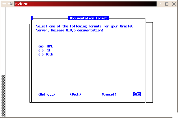 Start the installer from your staging directory (./orainst /c). Select custom install. Click on OK to bypass the README files. Select Install, Upgrade or De-install software. Select Add/Upgrade Software. Press enter to acknowledge the environment variable setting for ORACLE_HOME. Press enter to acknowledge the location of the log files. Select Install from Staging Area. Press enter to acknowledge the path of the staging area. Select the appropriate language. Select Append to append to the root.sh script created during the software installation process. This is done because we haven't run the script yet, and we don't want to overlay the script created in the previous step. Press return at the Information screen, which gives the location for the root.sh script. Select the Intel LINUX Documentation and tab to install. Press return to begin the installation process. Press return to acknowledge the location of the on-line documentation (see Figure 16). Select the format (HTML or PDF) you want for the on-line documentation (see Figure 17). Once again, we're looking for the message, ``The requested action has been performed for selected products.'' Press return to acknowledge the message, tab to Exit, then press return. Select Yes from the Confirmation screen to exit the installer. Again, we hope to see the installer exit with a message of ``Result: Success''.