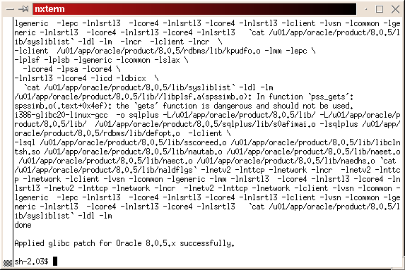 Change to the directory where you downloaded the glibc patch file, glibcpatch.tgz. Unpack the file, tar -xvzf glibcpatch.tgz. Run the patch script glibcpatch.sh, sh glibcpatch.sh. The final screen should look something like Figure 18.