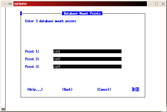 I recommend creating a minimum of three partitions for Oracle. This allows you to use Oracle's Optimum Flexible Architecture (OFA) standard. Using OFA gives you the capability to segregate data from indexes and have multiple control files. The partitions should be named u01, u02 and u03. You can create more partitions if you have the disks to support them. I have two disks on my machine, so I created a partition of 1GB for /u01 and 150MB for /u02. I then created a directory called /u03 to give me the equivalent of another mount point. The first partition (/u01) is where the Oracle executables and all associated files will be placed during the installation process. The remaining mount points will be used for data files, indexes and control files.