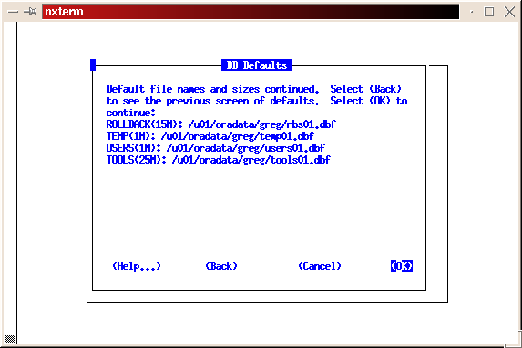 The data files, indexes and control files will be placed in /oradata/SID, where SID is the system identifier for the instance (i.e., /u01/oradata/greg, /u02/oradata/greg and /u03/oradata/greg for this installation).