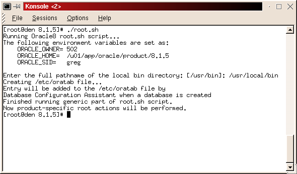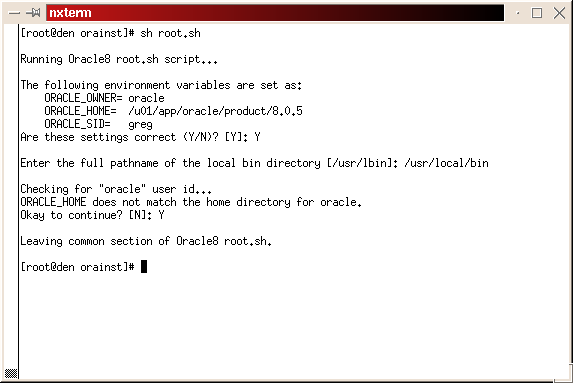 When it asks for the full path name to your local bin directory, enter /usr/local/bin. The script then tells you ORACLE_HOME does not match the home directory for oracle. This is not a problem. Type a Y and continue. The script will complete. (See Figure 26)