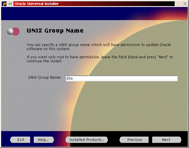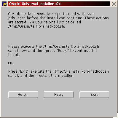 You should see a welcome screen like Figure 29. Click ``Next''. You will be prompted for the location of the installation jar file and your Oracle home directory. Make any necessary changes and click ``Next'' (Figure 30). Enter the dba group you created in the previous step (Figure 31) and click ``Next''. You will be prompted to run /tmp/OraInstall/orainstRoot.sh (Figure 32). After you run it, you should see the following lines of output: