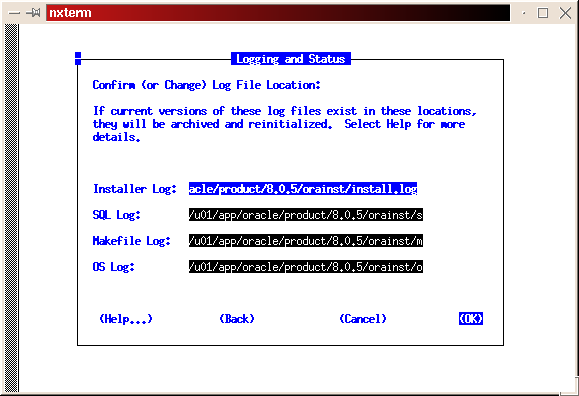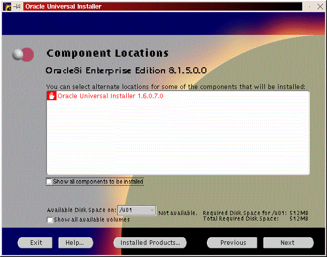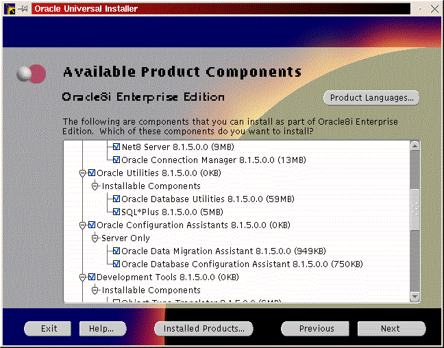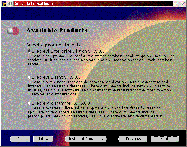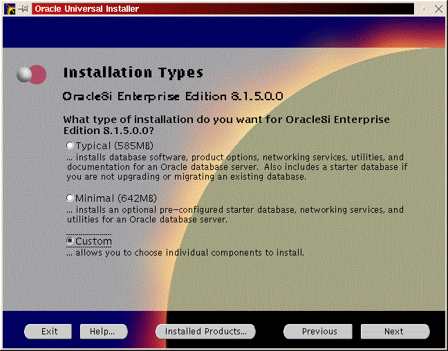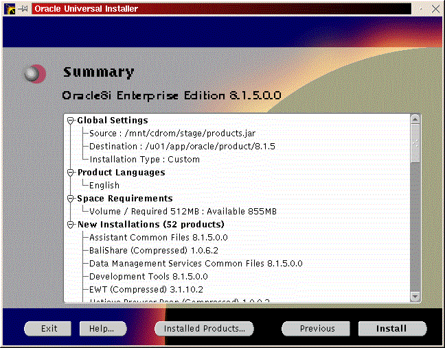 You will be prompted to install the Oracle8i Enterprise Server, Oracle8i Client or Oracle Programmer. Select the ``Enterprise Serveri'' (Figure 50) and click ``Next''. You will be prompted for the type of install. Select ``Custom'' (Figure 33) and click ``Next''. You will be prompted for which products you want to install (Figures 34, 35, 36). After you have selected the products to install, click ``Next''. You can change the locations the products will be installed in or click ``Next'' to take the defaults (Figure 37). You will be prompted to create the database using the Oracle Database Configuration Assistant (DBCA). Select ``Yes'' and click ``Next'' (Figure 38). You will be prompted for the Global Database Name and the SID. Modify the screen capture to reflect your names (Figure 39). You will be prompted for the location of your database files. In my example, I used the mount point /u01 (Figure 40). You will prompted to select which network protocol(s) to install based on which protocols are present on your machine (Figure 41) click ``Next''. You will see a summary of your install options. This will allow you to use the ``Previous'' button to change any settings that are incorrect (Figure 42). When you are ready to begin the install process click ``Install''. The install screen will list where the log file from the install is being written. This information will come in handy if something goes wrong during the installation. When the install is complete, you will see a pop-up window (Figure 45). Note the location of the script to run as root, change to the directory where the root.sh script is located and run it. You may have to change the permissions on it to make it executable.