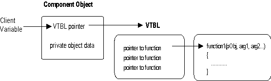 For any given platform (hardware and operating system combination), COM defines a standard way to lay out virtual function tables (vtables) in memory, and a standard way to call functions through the vtables. Thus, any language that can call functions via pointers (C, C++, Small Talk®, Ada, and even Basic) all can be used to write components that can interoperate with other components written to the same binary standard. The double indirection (the client holds a pointer to a pointer to a vtable) allows for vtable sharing among multiple instances of the same object class. On a system with hundreds of object instances, vtable sharing can reduce memory requirements considerably.
