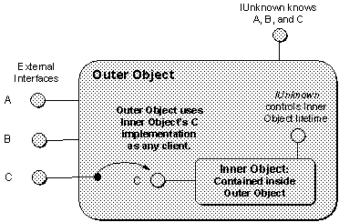 Aggregation is almost as simple to implement. The trick here is for COM to preserve the function of QueryInterface for component object clients even as an object exposes another component object's interfaces as its own. The solution is for the inner object to delegate IUnknown calls in its own interfaces, but also allow the outer object to access the inner object's IUnknown functions directly. COM provides specific support for this solution.