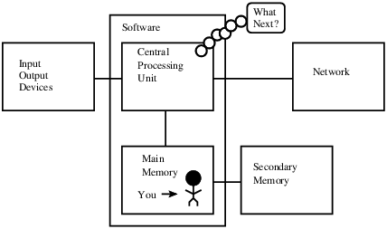 As a programmer, your job is to use and orchestrate each of these resources to solve the problem that you need to solve and analyze the data you get from the solution. As a programmer you will mostly be “talking” to the CPU and telling it what to do next. Sometimes you will tell the CPU to use the main memory, secondary memory, network, or the input/output devices.