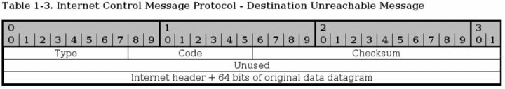 The first three fields seen in the image are the same as previously described. The Destination Unreachable type has 16 basic codes that can be used, as seen below in the list.