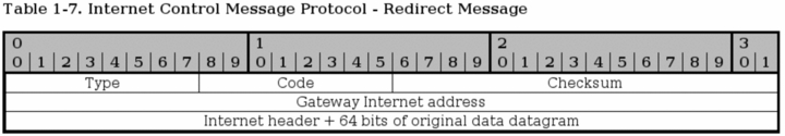 The main header of the Redirect type is the Gateway Internet Address field. This field tells the host about the proper gateway, which should really be used. The packet also contains the IP header of the original packet, and the 64 first bits of data in the original packet, which is used to connect it to the proper process sending the data.