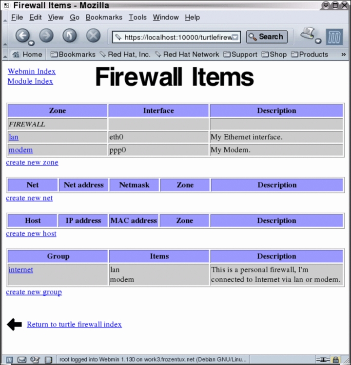 The above screenshot shows the items page of the Turtle Firewall, where you can configure network interfaces and networks, and other items.