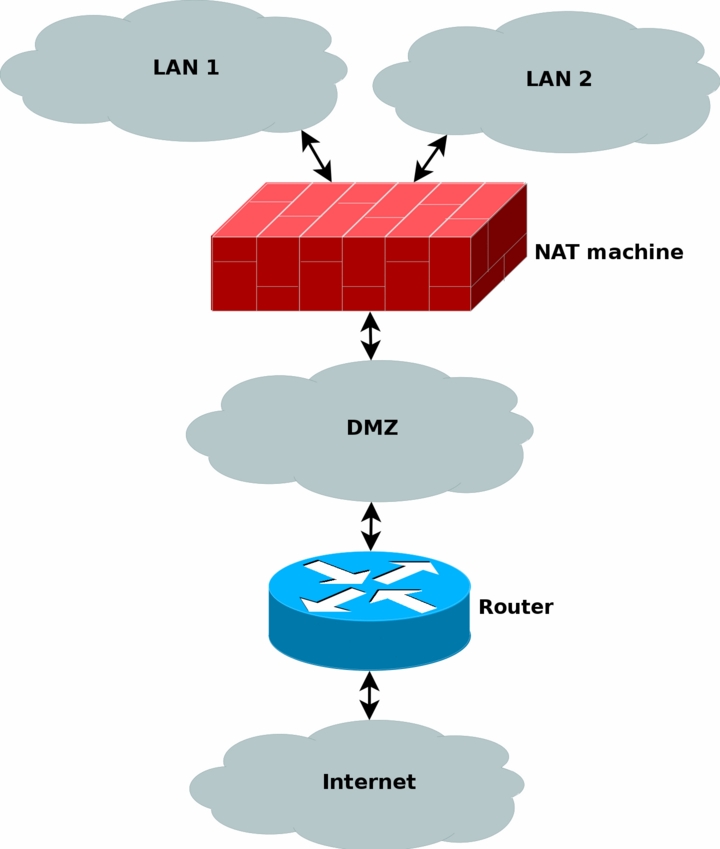 This is a small theoretical scenario where we want a NAT server between 2 different networks and an Internet connection. What we want to do is to connect 2 networks to each other, and both networks should have access to each other and the Internet. We will discuss the hardware questions you should take into consideration, as well as other theory you should think about before actually starting to implement the NAT machine.