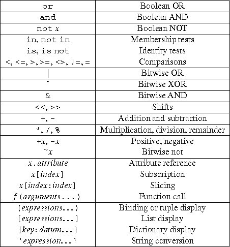 The following table summarizes the operator precedences in Python, from lowest precedence (least binding) to highest precedence (most binding). Operators in the same box have the same precedence. Unless the syntax is explicitly given, operators are binary. Operators in the same box group left to right (except for comparisons, which chain from left to right --- see above).
