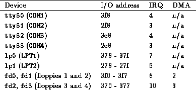 Table 2.2 is a list of IRQ and DMA channels used by various ``standard'' devices found on most systems. Almost all systems will have some of these devices, so you should avoid setting the IRQ or DMA of other devices in conflict with these values.
