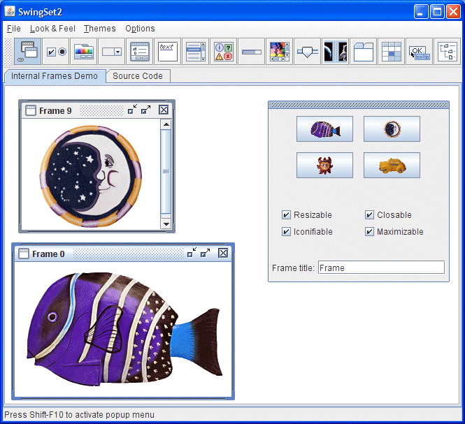 When you download the JDK and JavaFX Demos and Samples bundle and open it up, there is a demo\jfc folder that contains a demonstration program called SwingSet2. This program has a graphically rich GUI and allows you to change the Look and Feel from the menu. Further, if you are using the Java (Metal) Look and Feel, you can choose a variety of different themes. The files for the various themes (for example, RubyTheme.java) are found in the SwingSet2\src folder.