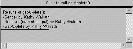 getApplets. (Here's the whole program.)public void printApplets() { //Enumeration will contain all applets on this page (including //this one) that we can send messages to. Enumeration e = getAppletContext().getApplets(); . . . while (e.hasMoreElements()) { Applet applet = (Applet)e.nextElement(); String info = ((Applet)applet).getAppletInfo(); if (info != null) { textArea.appendText("- " + info + "\n"); } else { textArea.appendText("- " + applet.getClass().getName() + "\n"); } } . . . }