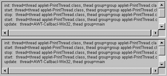 Below are two PrintThread applets. PrintThread is a modified version of SimpleApplet that prints the thread and thread group that its init, start, stop, destroy, and update methods are called from. (Actually, due to a Netscape Navigator 2.0 for Windows 95/NT bug, the following applets don't implement update. If you aren't using a PC that's running Netscape Navigator 2.0, you should be able to run the real example.) Here's the code for the hobbled example, and for the more interesting example. As usual, to see the output for the methods such as destroy that are called during unloading, you need to look at the standard output. See Displaying Diagnostics to the Standard Output and Error Streams for information about the standard output stream.